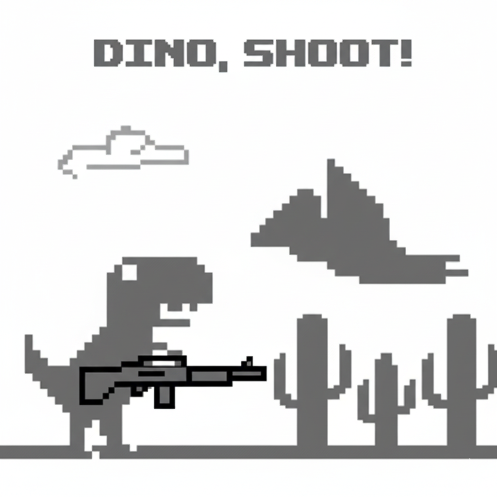 Dino, Shoot! turns the classic dino game into an action-packed adventure. Dash, jump, dodge, and blast through the desert chaos! Instead of simply running and jumping, you’ll collect weapons, blast through obstacles, and take on flying foes in an endless race for survival and glory. Every cactus, pterodactyl, and weapon you encounter brings you closer to dominating the leaderboard.