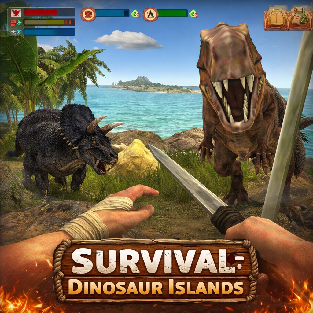 Survival: Dinosaur Islands is a hardcore survival simulator set in a world where dinosaurs never went extinct. You awaken stranded on a remote island with no tools, no shelter, and no protection. Your only objective is simple but unforgiving: survive as long as possible.